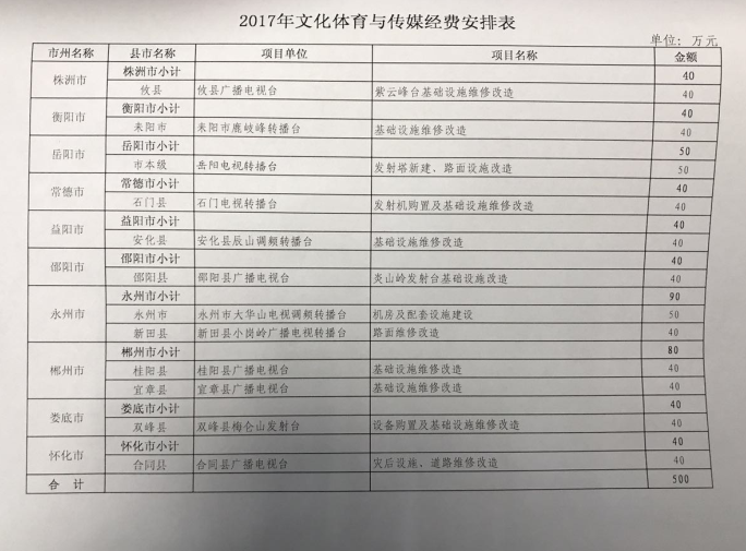 湖南省财政厅关于下达2017年文化体育与传媒经费的通知