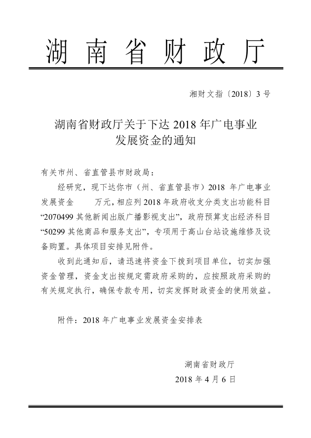 湖南省财政厅关于下达2018年广电事业发展资金的通知