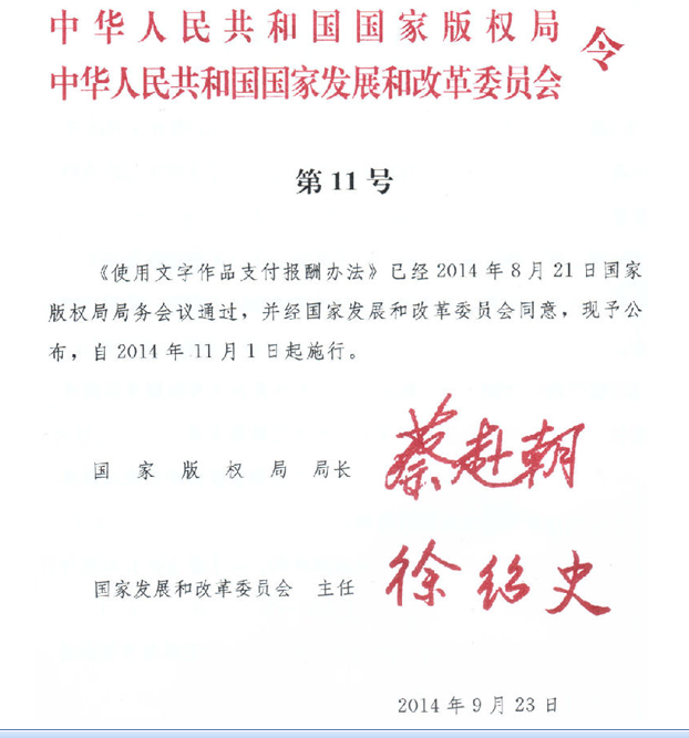 国家版权局和国家发展和改革委员会令 第11号 使用文字作品支付报酬办法