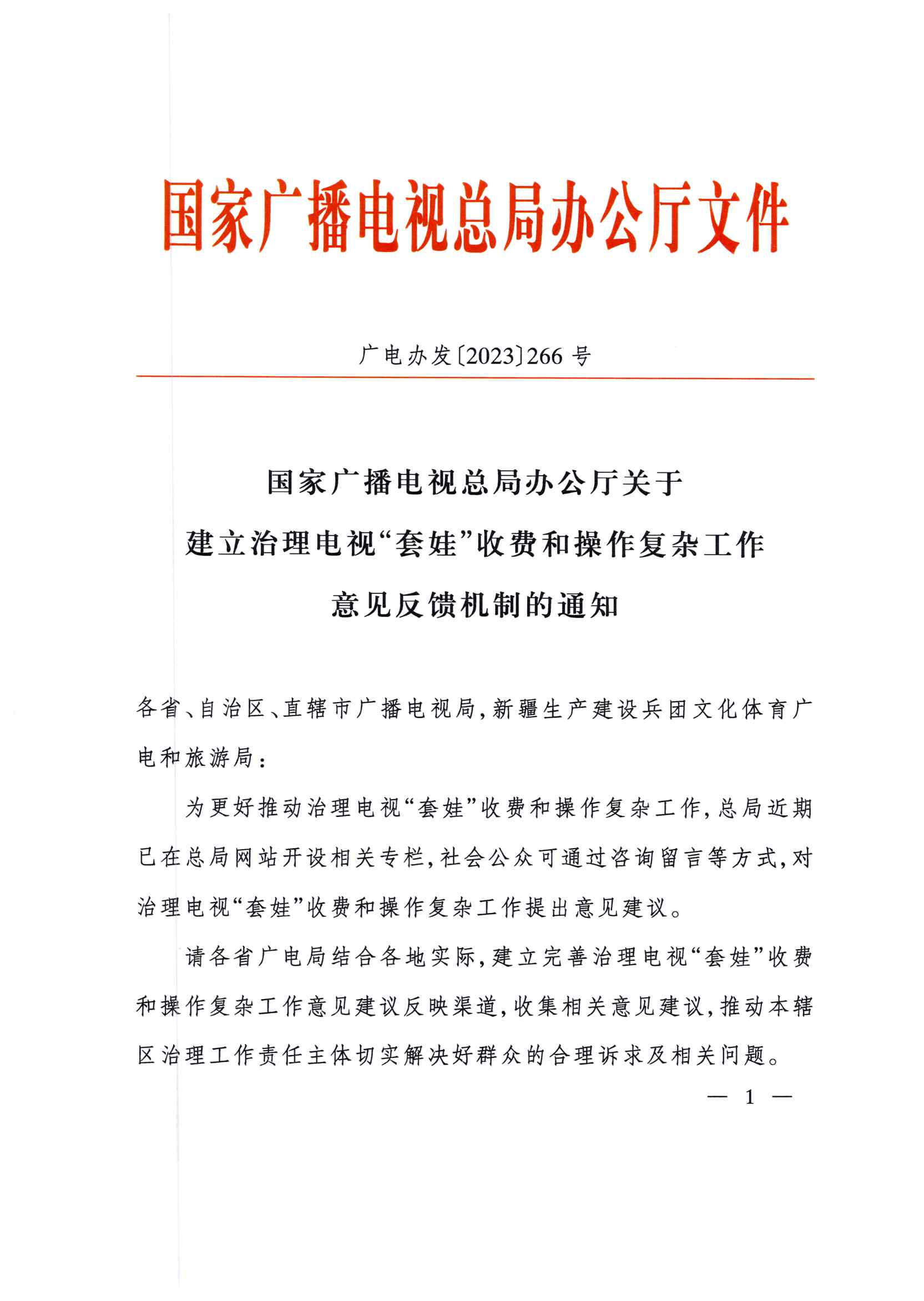 国家广播电视总局办公厅关于建立治理电视“套娃”收费和操作复杂工作意见反馈机制的通知